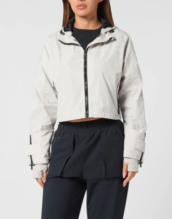 This nylon, zip-up crop hoodie is right for the warm-up session of any sport. Light-weight, comfortable and soft.
